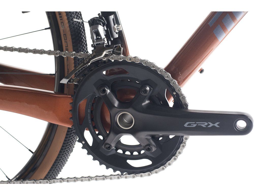2x12 gravel s karbonową ramą i widelcem, hydrauliczna grupa Shimano GRX610 2x12, zaplatane koła TOKEN G23AR, kevlarowe opony Schwalbe G-One Allround, kierownica, mostek i sztyca Ritchey, owijka Supacaz Super Sticky Kush