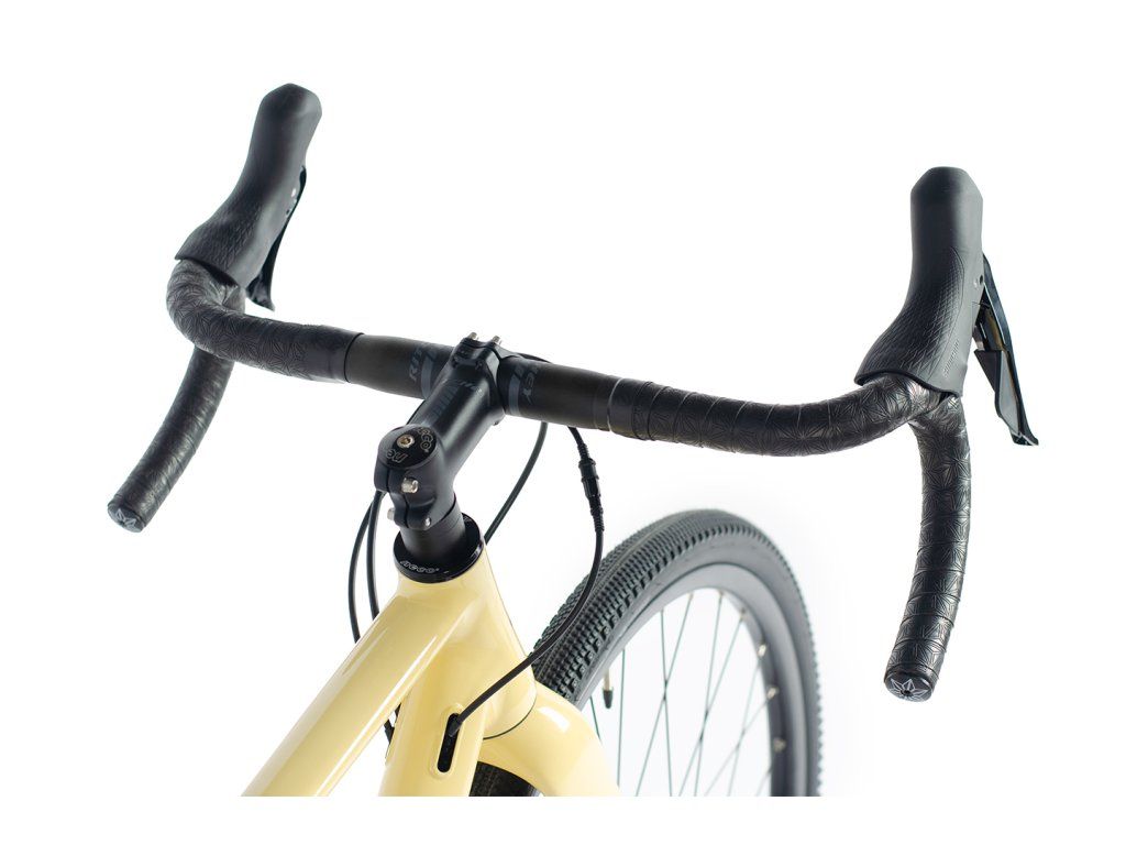 2x10 gravel z aluminiową ramą i w pełni karbonowym widelcem, hydrauliczna grupa Shimano GRX400, koła zaplecione Ryde/Shimano RS470, opony Schwalbe G-One Allround 40-622, kierownica, mostek i sztyca Ritchey, owijka Supacaz Super Sticky Kush