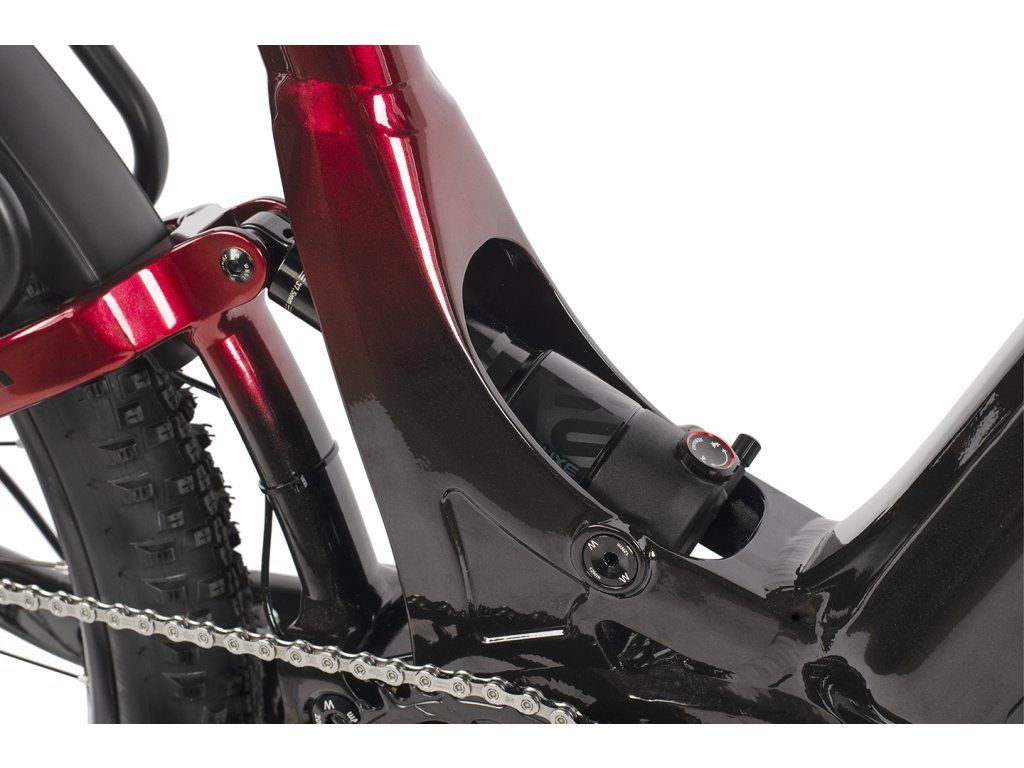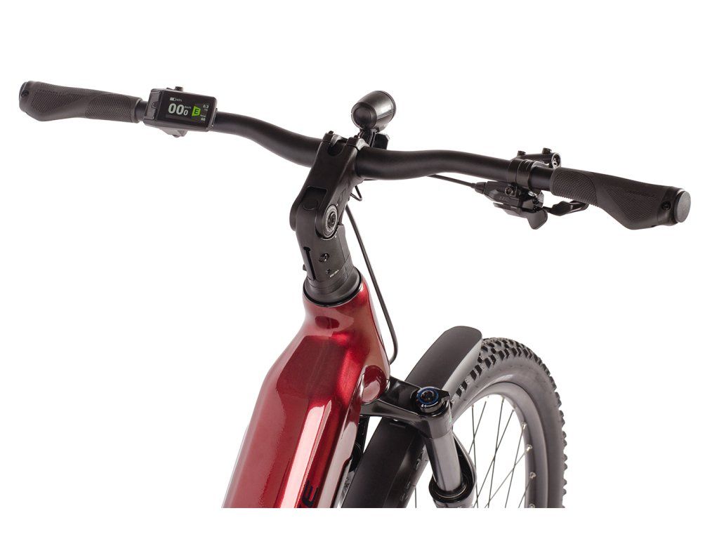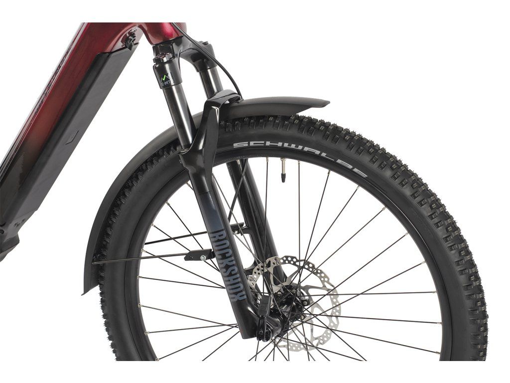 1×11 full SUV 27,5" rower elektryczny z niskim przekrokiem i centralnym silnikiem Bafang M510 (250 W, do 110 Nm), bateria 720 Wh, 20 Ah z ogniwami Samsung, zasięg do 180 km, amortyzowany widelec RockShox Recon Silver RL Crown oraz tylny amortyzator RockShox Deluxe Select 165×37.5, manetka Shimano Cues SL-U6000, przerzutka Shimano Cues RD-U6000, siodło DDK-D102MF Comfort Plus, wyposażenie: oświetlenie, błotniki, bagażnik i podpórka.