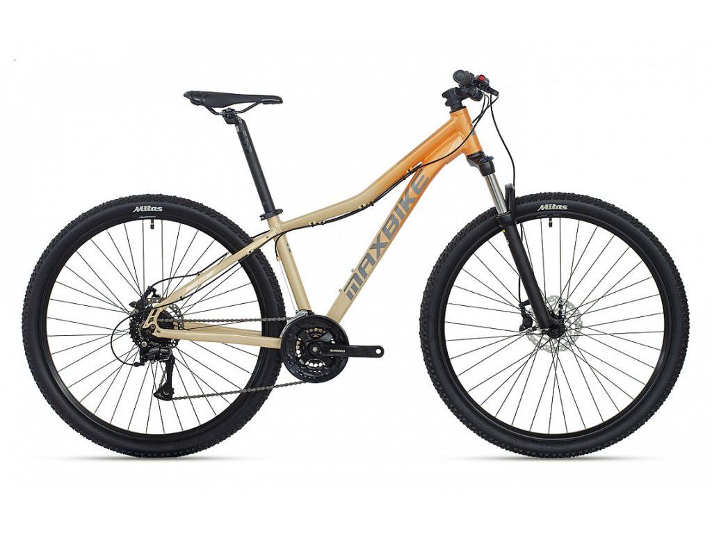 3x8 damski rower górski 29" z aluminiową ramą Maxbike M509, manetki Shimano SL-M315, przerzutka tylna Shimano Acera RD-M3020, przerzutka przednia Shimano Acera FD-TY500, widelec ZOOM 595S AMS 29” Disc HLO o skoku 100 mm, kaseta Shimano CS-HG31 11-32T, hamulce ZOOM HB-875 z tarczami 160 mm, siodło DDK MTB.