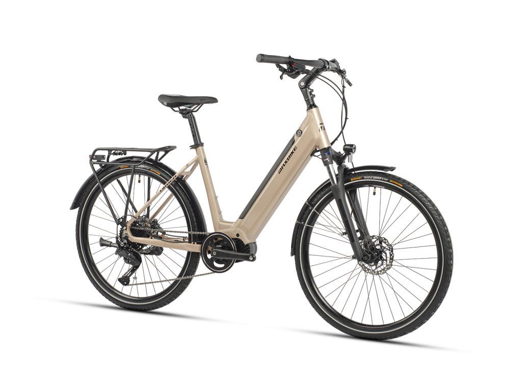 1×9 miejski 26" rower elektryczny z niską ramą i centralnym silnikiem Bafang M300 (250 W, do 80 Nm), baterią 630 Wh (17,5 Ah), amortyzowanym widelcem Suntour NEX HLO, manetką Shimano CUES SL-U4010, przerzutką Shimano CUES RD-U4020, siodłem DDK-D102MF Comfort Plus oraz wyposażeniem: oświetlenie zasilane z baterii roweru elektrycznego, błotniki, bagażnik i podpórka.